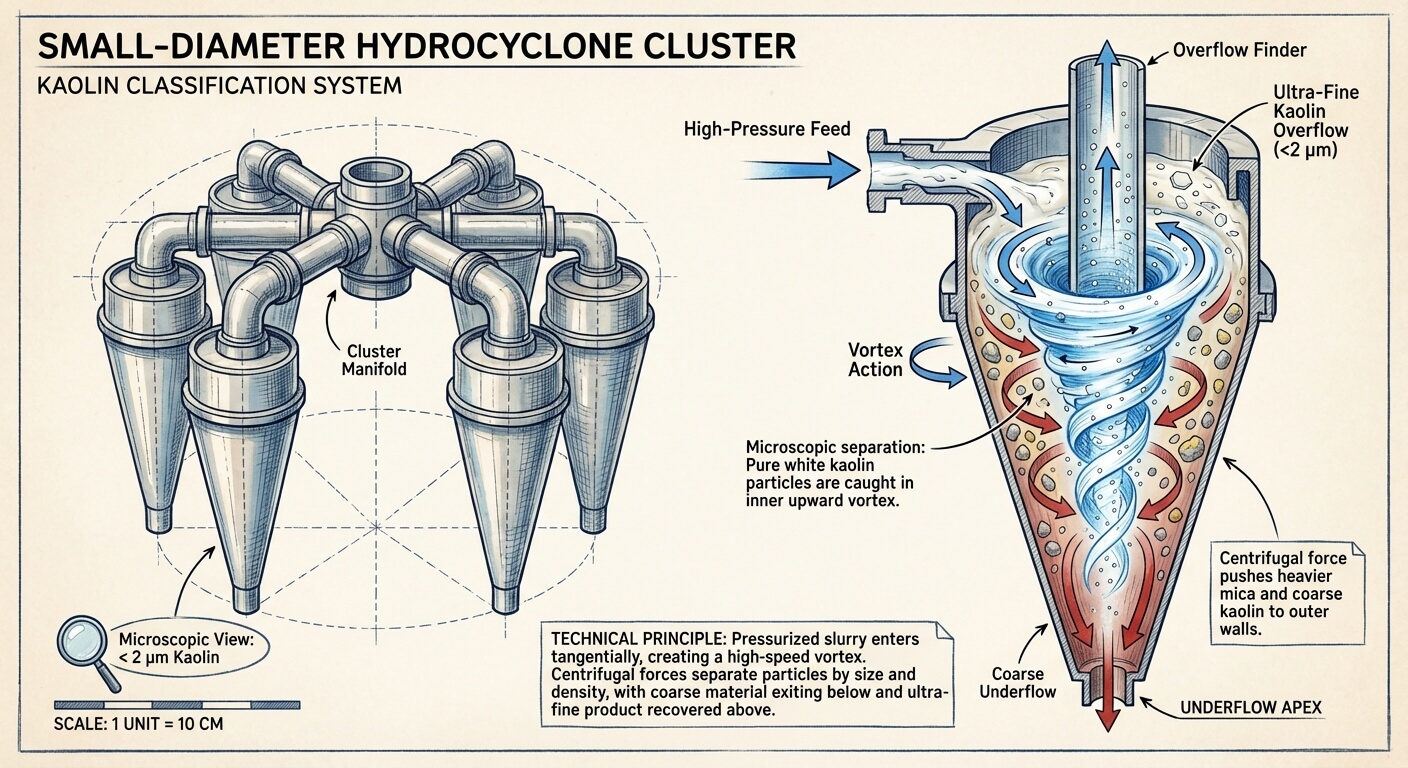 To achieve this microscopic cut, OreSolution employs Multi-Stage Small-Diameter Hydrocyclones. These are highly specialized polyurethane cyclones (often only 50mm or 75mm in diameter) operating at high pressure. The slurry is pumped through multiple stages of these micro-cyclones, precisely separating the ultra-fine kaolin (overflow) from the slightly coarser kaolin and fine mica (underflow).