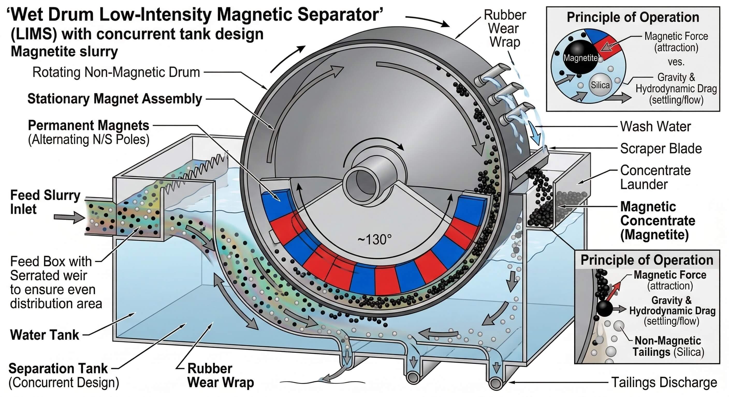 1. Грубая магнитная сепарация (коббинг): после грубого измельчения шлам проходит через мокрый барабанный магнитный сепаратор низкой интенсивности (LIMS). Магнит извлекает магнетит из шлама, мгновенно отбрасывая огромный объем немагнитных отходов кремнезема (хвостов).