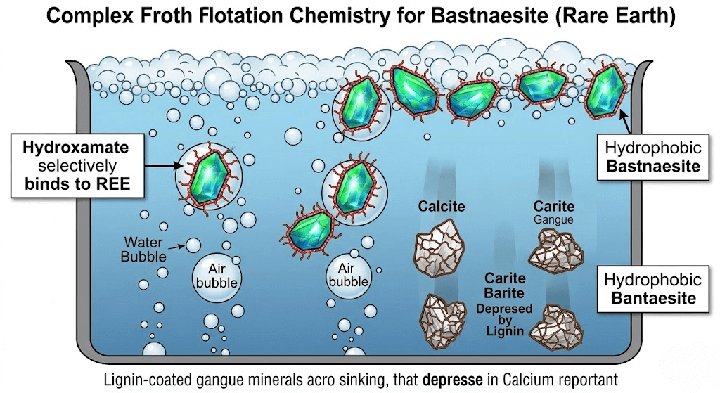 Подобно шеелиту, флотация бастнезита часто получает огромную выгоду от «этапа нагрева». Путем перекачивания грубого концентрата в кондиционирующий резервуар с паровой рубашкой и нагрева его до 70–90 °C с высокими дозами депрессантов, связь коллектора с кальцитом и баритом термически разрушается, в то время как связь РЗМ-гидроксамита остается стабильной. Последующая чистая флотация дает концентрат высшего качества (>60% REO).