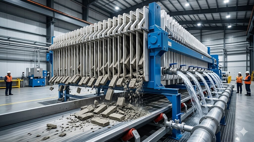 3. Final Moisture Removal (Dry Stacking) High-Pressure Membrane Filter Press Squeezes the thick slurry into solid, dry cakes (15% moisture). These cakes are stacked safely with bulldozers. No dam required. No risk of collapse. 100% water recycling.